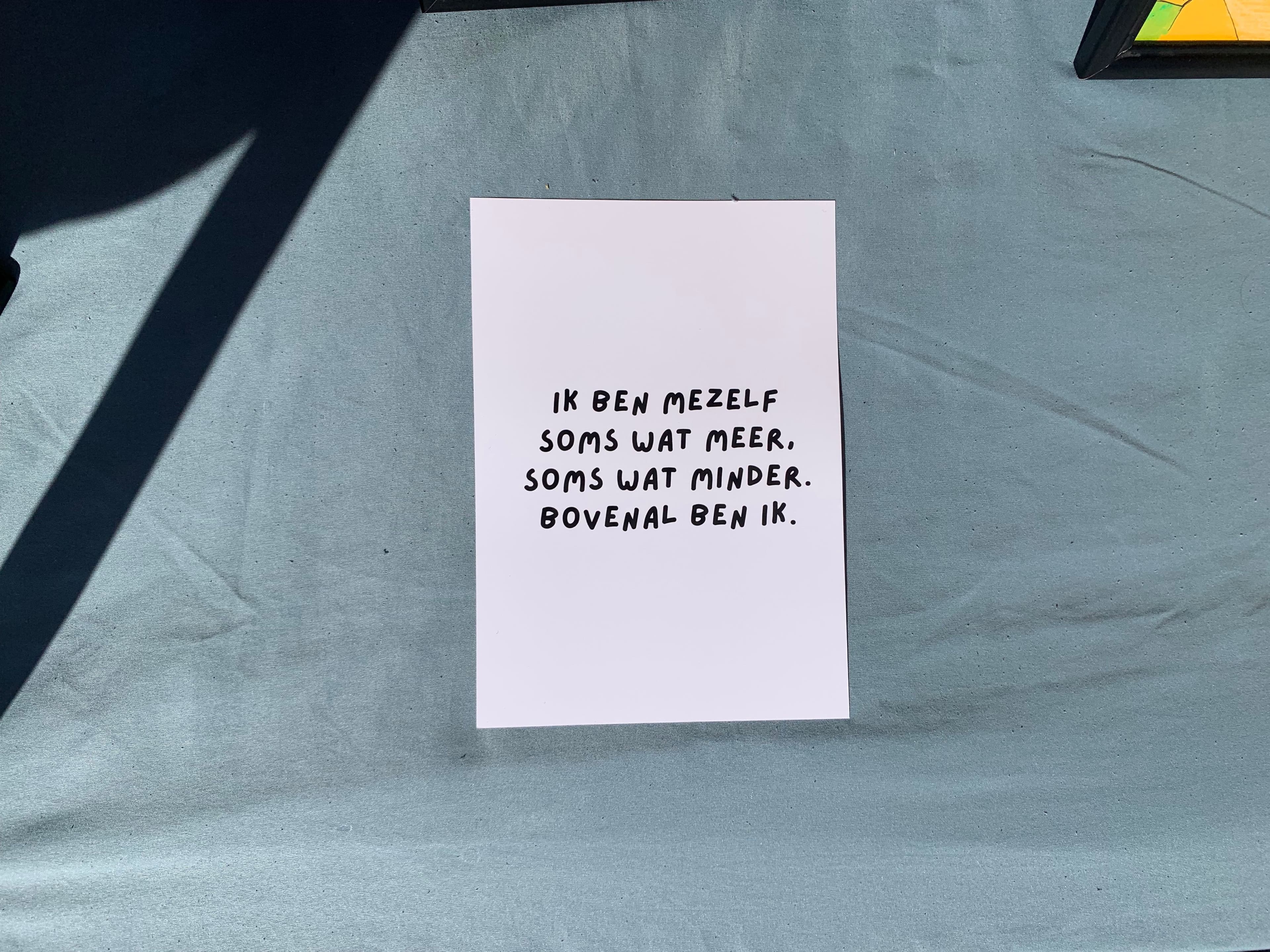 Quote van een spoken word tekst geschreven door Cathelijne, tijdens Poetry Circle 010 (2022). Ook beschikbaar in liggend formaat, met een gele achtergrond.